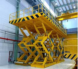 載重要求10噸,由于臺面比例較大,所以我們?yōu)槠湓O計的是雙跨式設計,采用8只液壓油缸頂升,保證剪叉升降機在運行時的穩(wěn)定性。