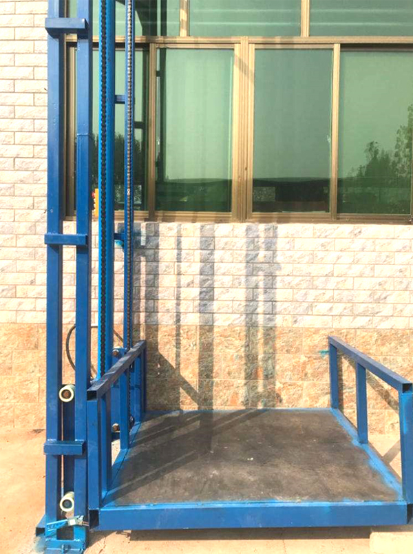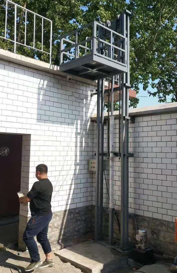小型單軌式液壓升降貨梯是由導(dǎo)軌、臺面、鏈條、油缸、泵站、控制系統(tǒng)等組合而成的一種常見的液壓貨梯。