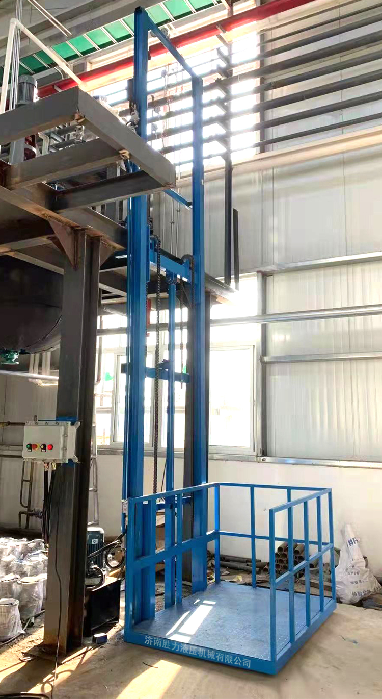 小型單軌式液壓升降貨梯是由導(dǎo)軌、臺面、鏈條、油缸、泵站、控制系統(tǒng)等組合而成的一種常見的液壓貨梯。