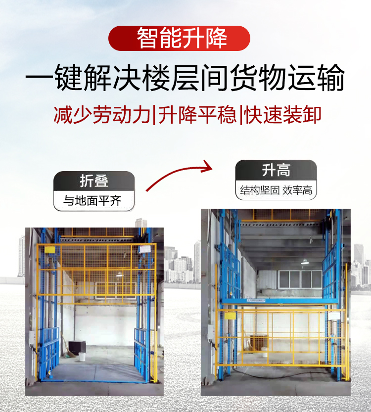液壓升降貨梯產(chǎn)品結(jié)構(gòu)堅(jiān)固,載重量大,升降平穩(wěn),操作簡(jiǎn)單安全方便,是經(jīng)濟(jì)實(shí)用的低樓層間替代電梯的理想貨物輸送設(shè)備。