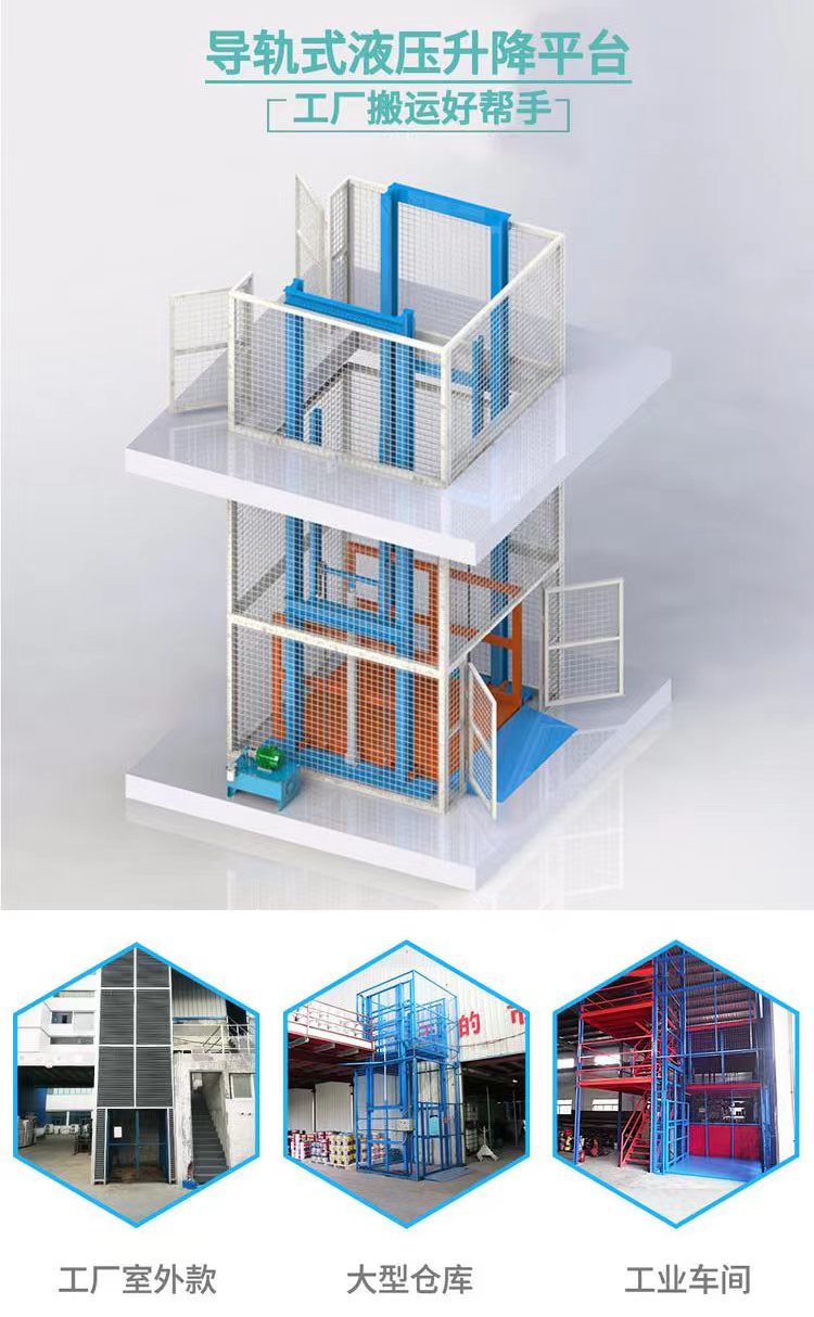 工廠液壓升降貨梯是一種用于工廠物料、成品等貨物的液壓升降機(jī)平臺(tái),平臺(tái)采用液壓油缸做動(dòng)力,通過重型鏈條和防墜鋼絲繩傳動(dòng),確保平臺(tái)運(yùn)行安全,因此也被稱作導(dǎo)軌式升降作業(yè)平臺(tái),此款設(shè)備在2015年開始不再屬于特種設(shè)備,工廠安裝時(shí)也無需向當(dāng)?shù)赜嘘P(guān)部門備案驗(yàn)收。